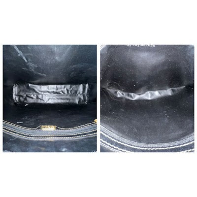 Wear: Minor interior stains/scuffs, very minor leather scuffs, minor strap glazing cracks/rubbing, leather at zipper dry