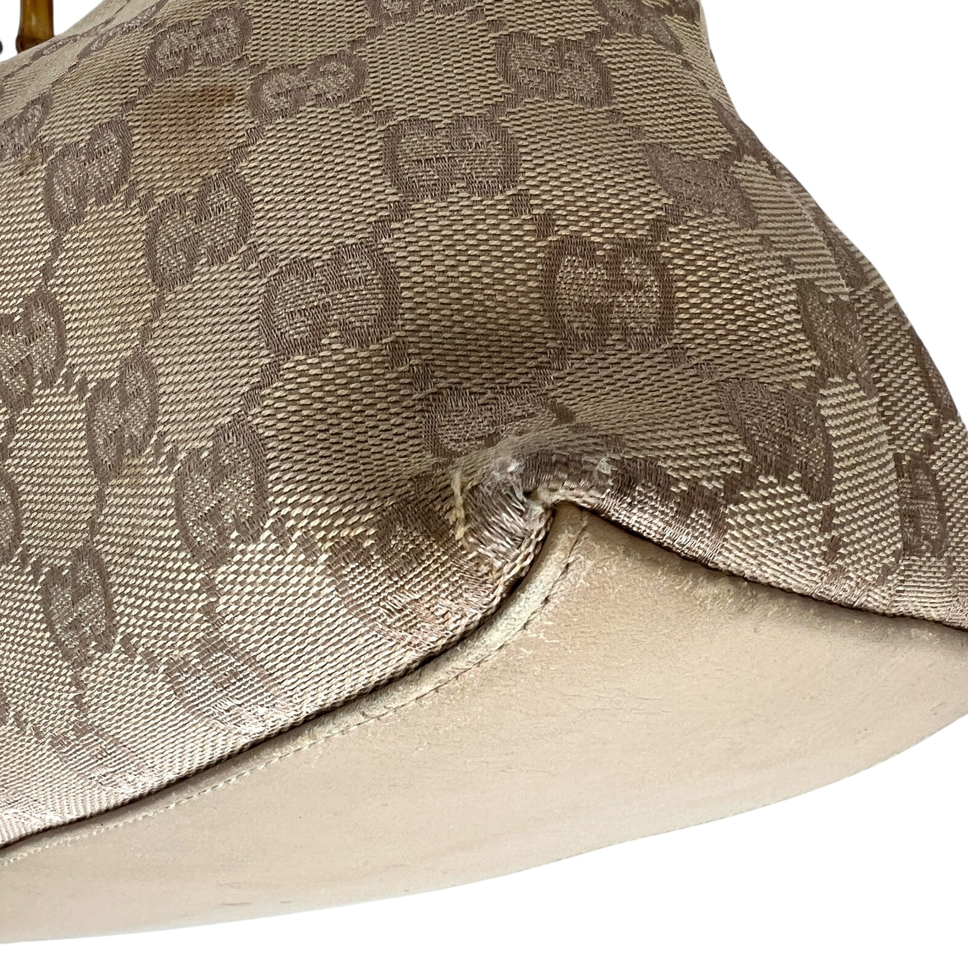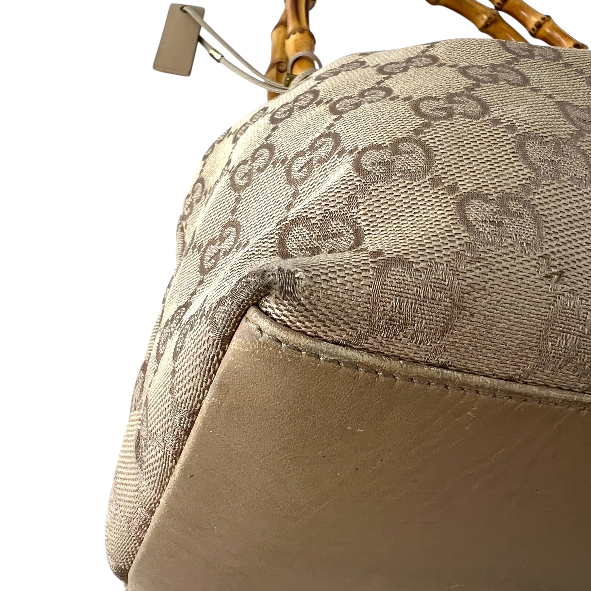 Wear: Very minor canvas stains, very minor corner rubbing, very minor scuffs on bottom, very minor bamboo scuffs, extremely minor bag charm dullness/fading
